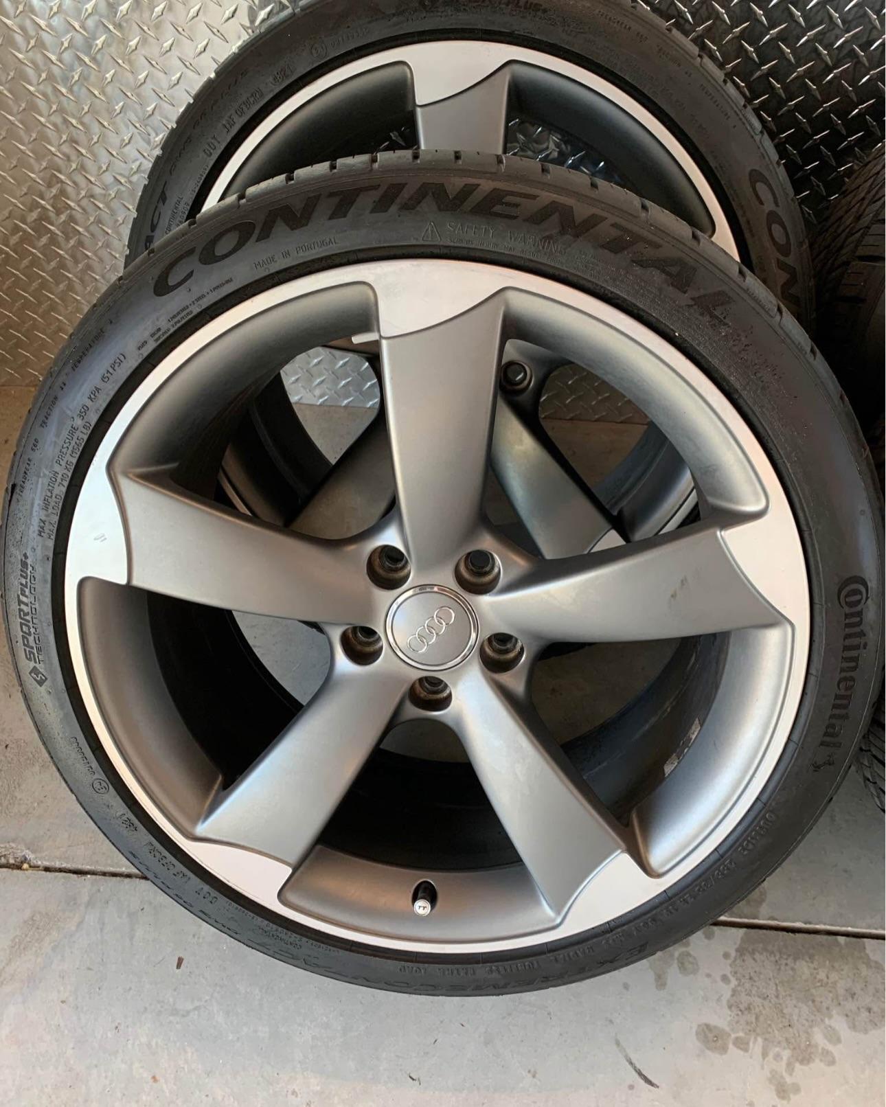 SET OF 4 genuine 19” Audi Rotor wheels with Continental extreme contact tires. Ready to bolt on. Tires have almost full tread remaining. Will fit MK2 TT and GTI Gold R Audi A4 S4 A3 S3 with spacers. 19×9 ET 52