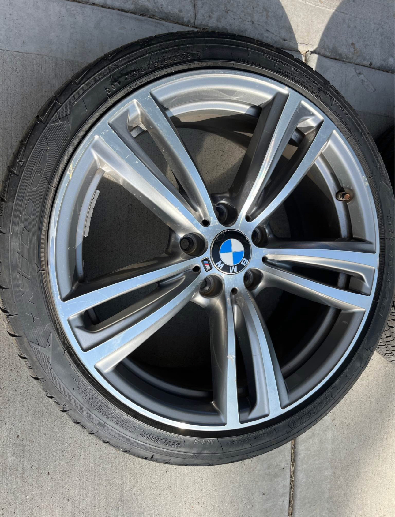 Wheels are in decent shape with no major curb rash but some small dings and clear coat issues. Tpms work. Balanced and smooth riding. Tires have good tread but are mismatched. Front tires look new. Fronts are 225/40/19 and rears are 255/35/19. These came off bmw 435i but should fit other 4 series and probably 2 and 3 series.
